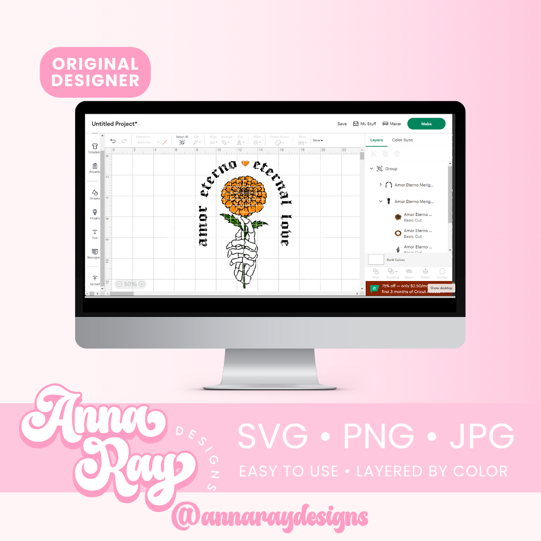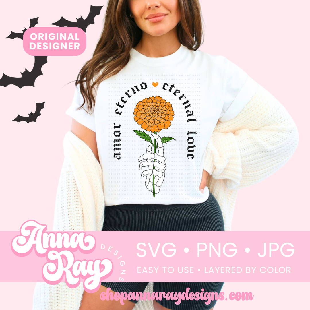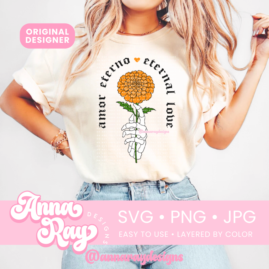 Amor Eterno Marigold SVG, PNG and JPG Digital Files. This Dia De Los Muertos design is perfect for creating items such as shirts, drink ware, stickers, tote bags and more! All of our files are easy to use, layered by color and compatible with Cricut Design Space and Silhouette Studio.
