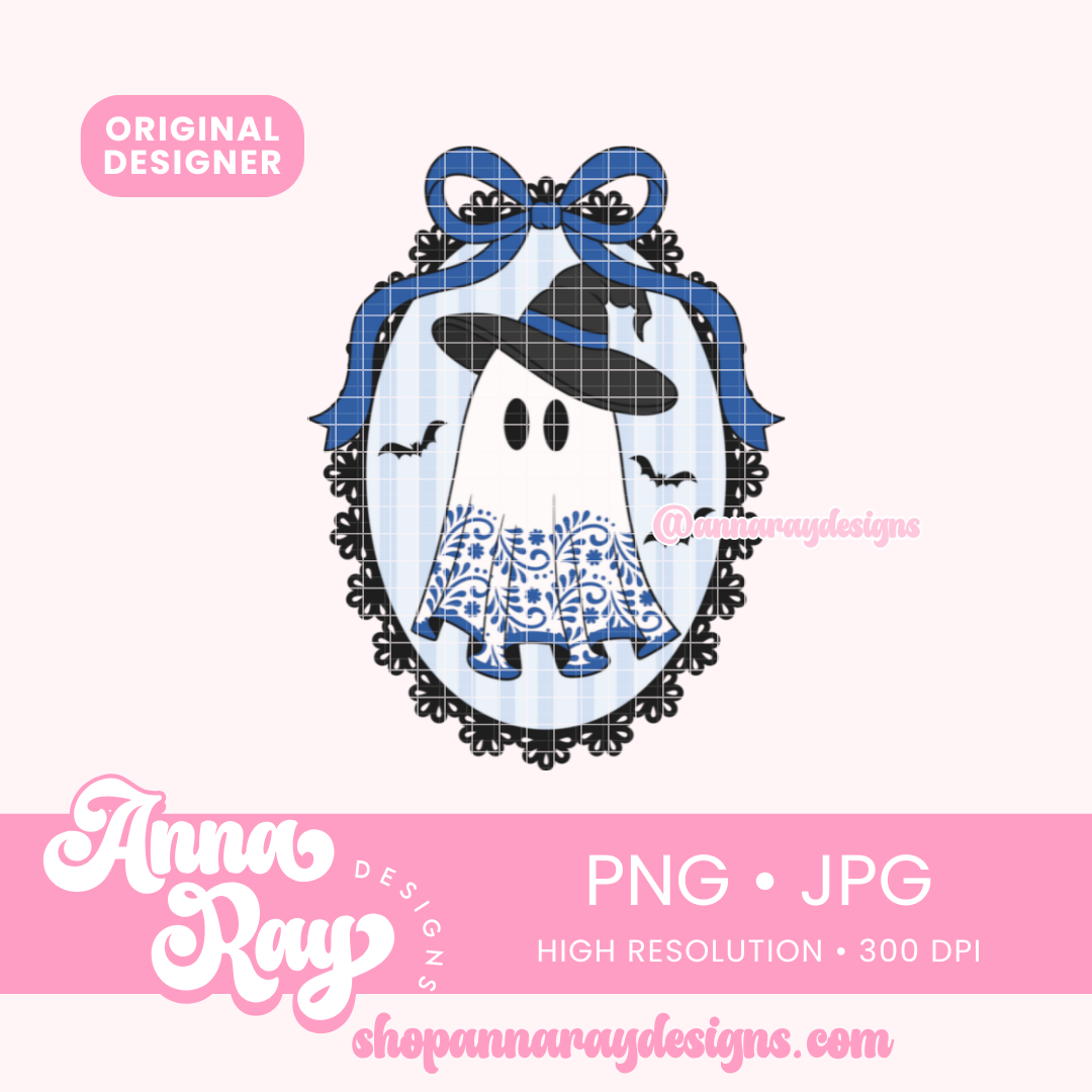 Blue Coquette Talavera Ghost PNG and JPG Digital Files. This coquette talavera design is perfect for crafting unique items like t-shirts, drinkware, stickers, tote bags, and more. All of our files are easy to use, layered by color and compatible with Cricut Design Space and Silhouette Studio.