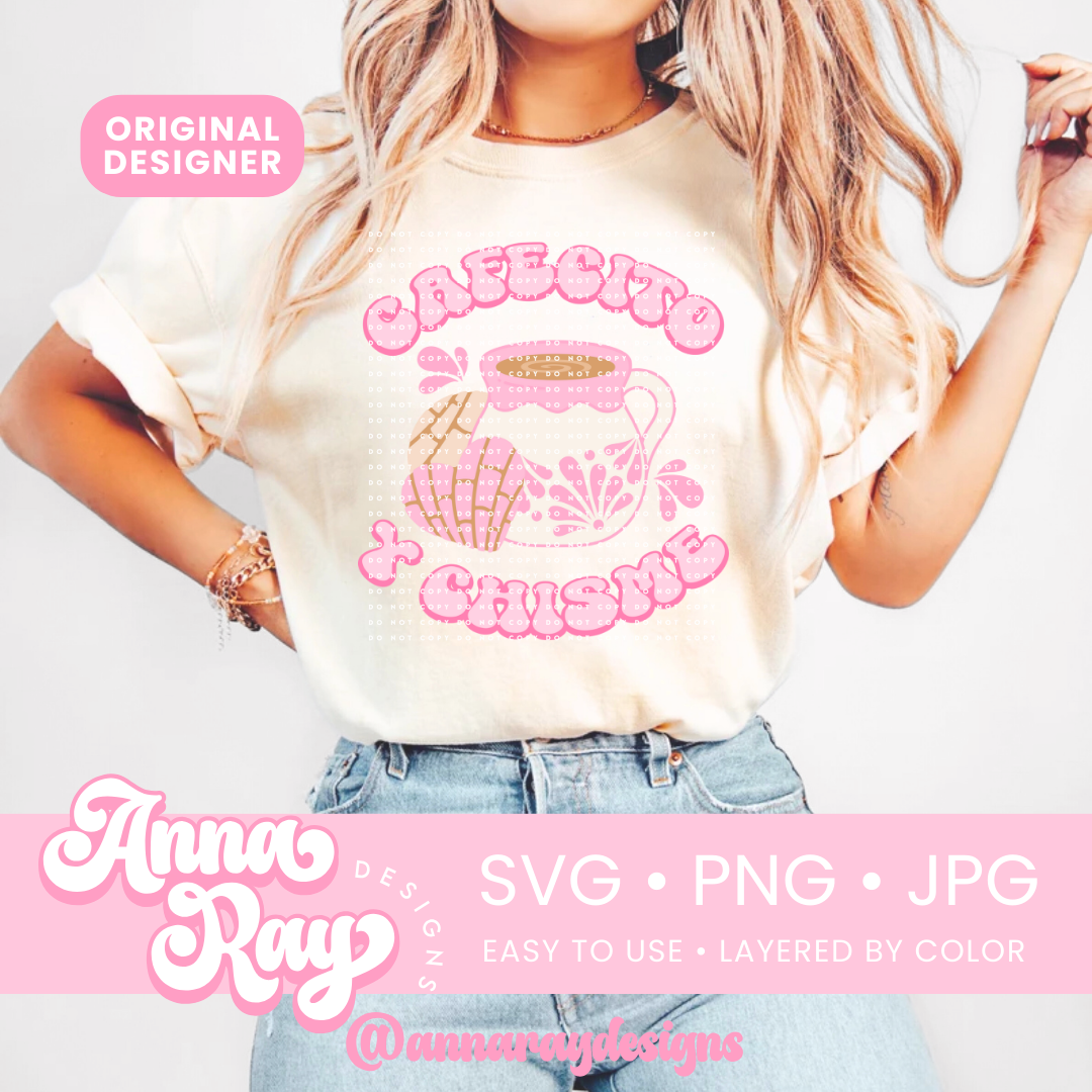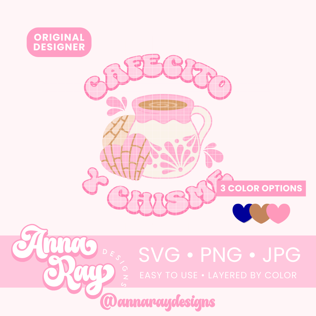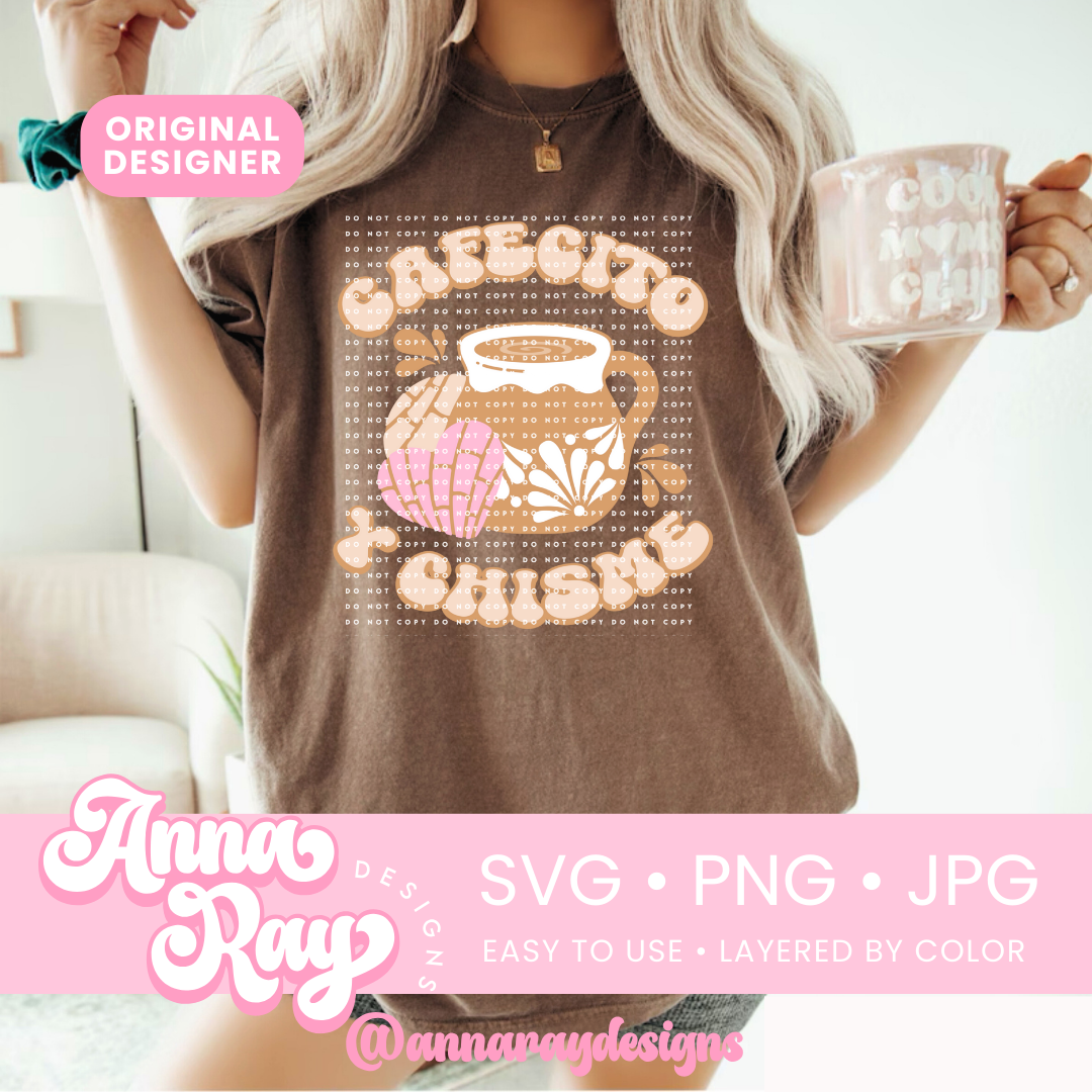 Cafecito Y Chisme SVG, PNG and JPG Digital Files. This Concha design is perfect for creating items such as shirts, cups, stickers, tote bags and more! All of our files are easy to use, layered by color and compatible with Cricut Design Space and Silhouette Studio.