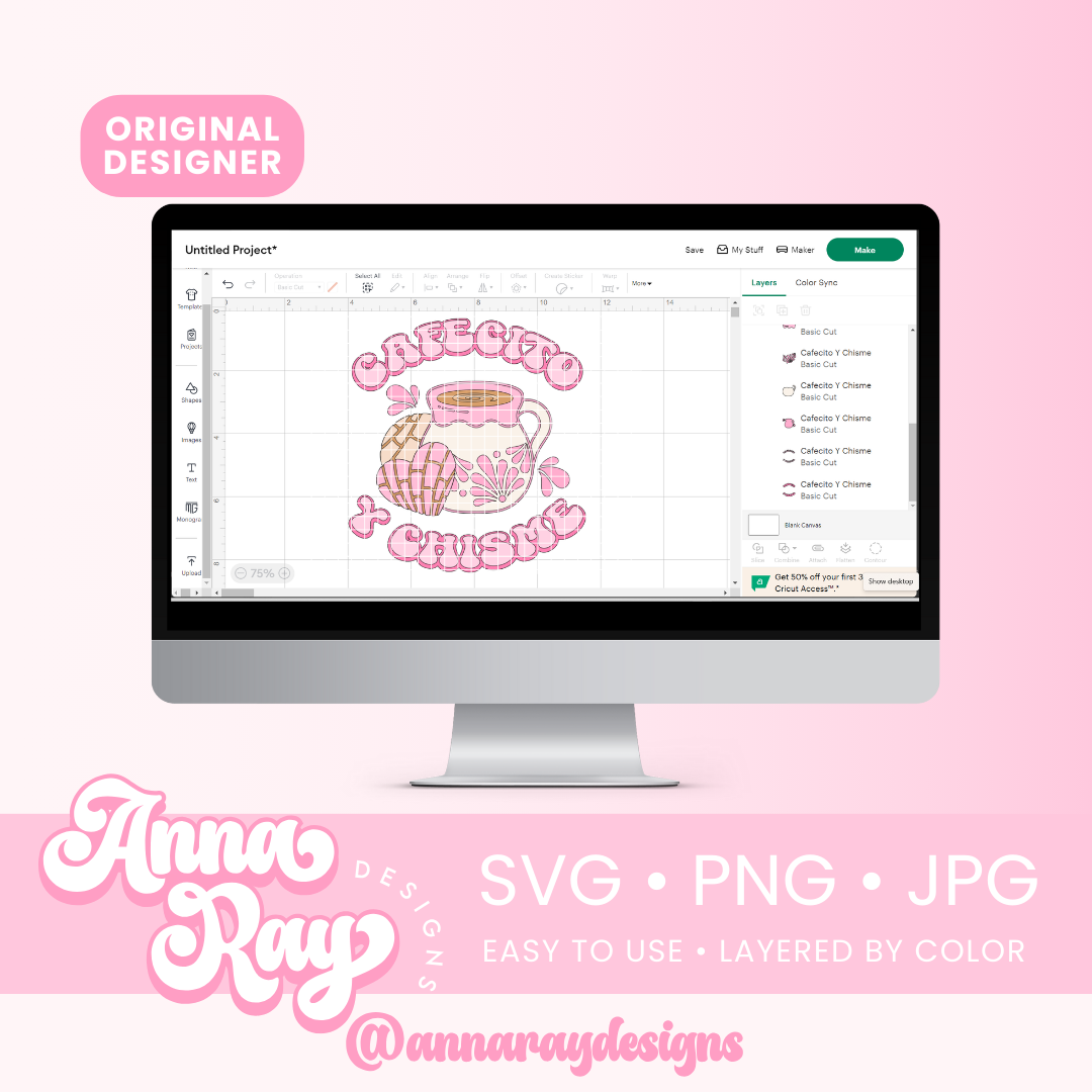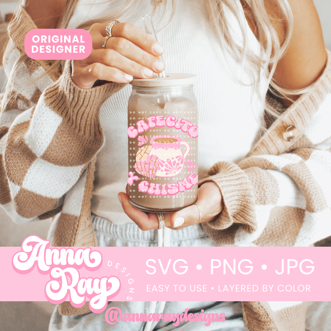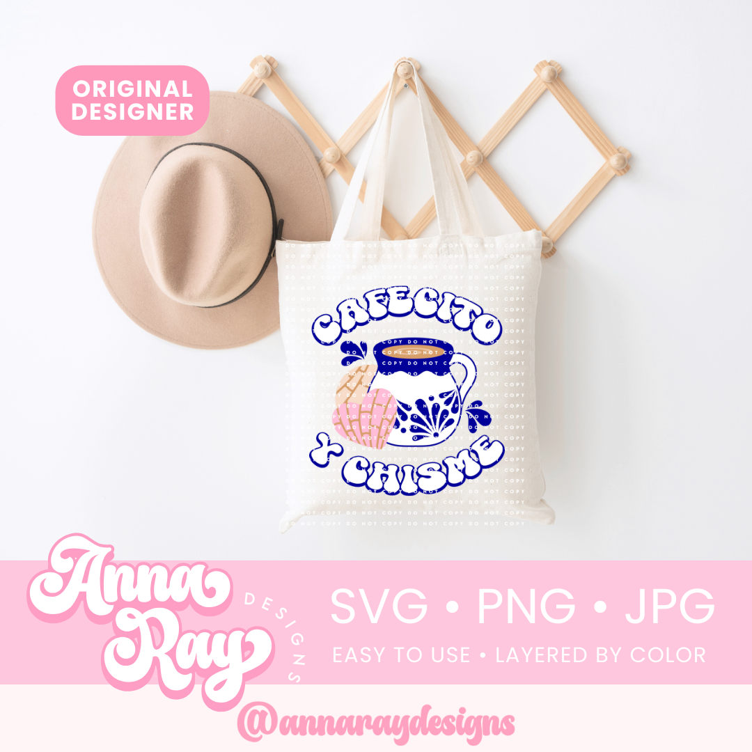 Cafecito Y Chisme SVG, PNG and JPG Digital Files. This Concha design is perfect for creating items such as shirts, cups, stickers, tote bags and more! All of our files are easy to use, layered by color and compatible with Cricut Design Space and Silhouette Studio.