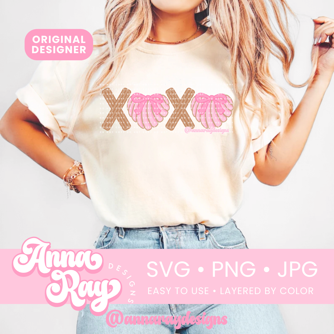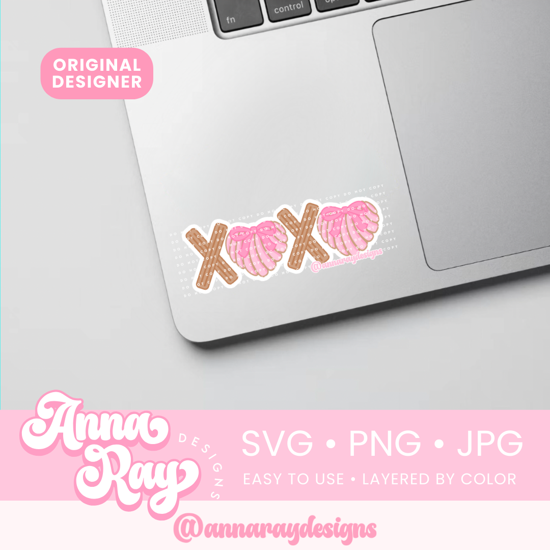 Concha Xoxo SVG, PNG and JPG Digital Files. This Concha design is perfect for creating items such as shirts, cups, stickers, tote bags and more! All of our files are easy to use, layered by color and compatible with Cricut Design Space and Silhouette Studio.
