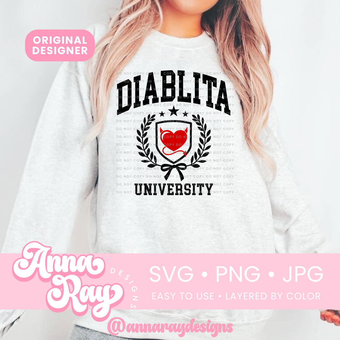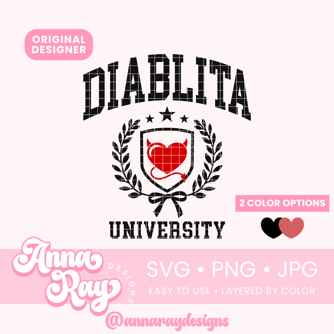 Diabla and Diablita University SVG, PNG and JPG Digital Files. This cute diablita design is perfect for creating trendy items such as shirts, drink ware, stickers, tote bags and more! All of our files are easy to use, layered by color and compatible with Cricut Design Space and Silhouette Studio.