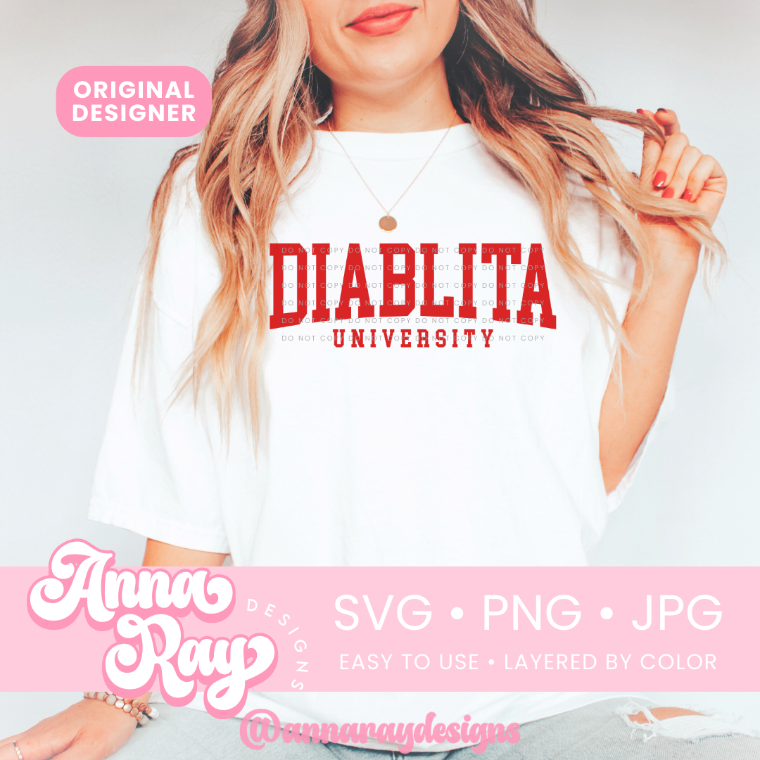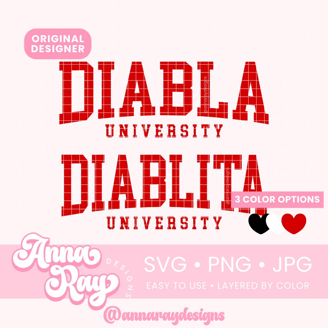 Diabla and Diablita University SVG, PNG and JPG Digital Files. These cute diabla designs are perfect for creating trendy items such as shirts, drink ware, stickers, tote bags and more! All of our files are easy to use, layered by color and compatible with Cricut Design Space and Silhouette Studio.