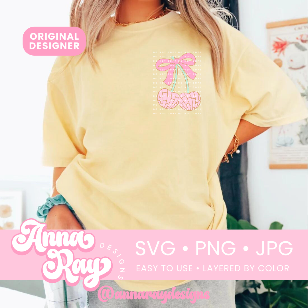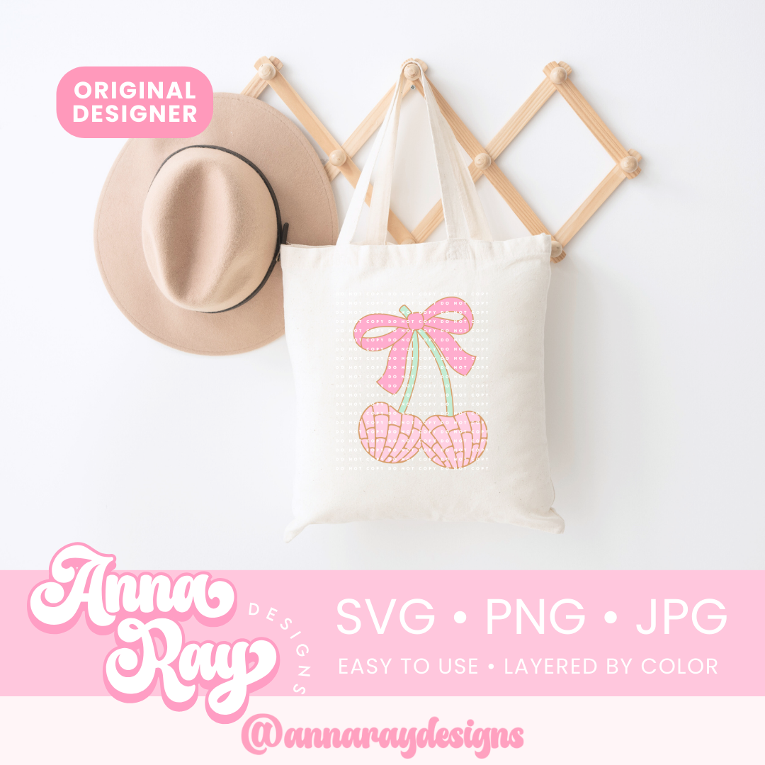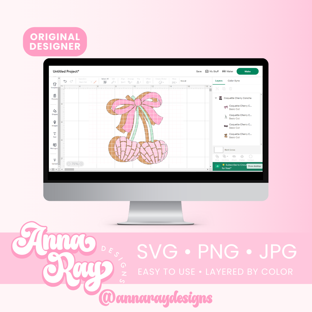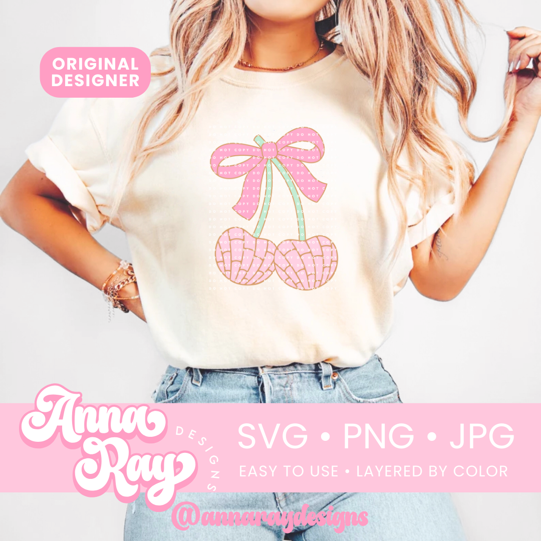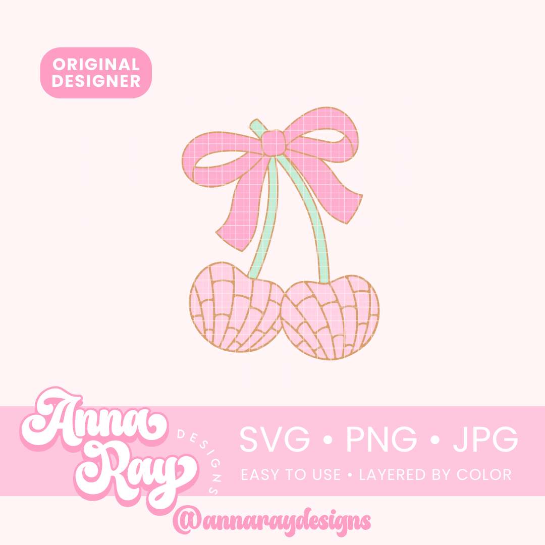 Coquette Cherry Concha SVG, PNG and JPG Digital Files. This Conchita design is perfect for creating items such as shirts, sweatshirts, stickers and more! All of our files are easy to use, layered by color and compatible with Cricut Design Space and Silhouette Studio.