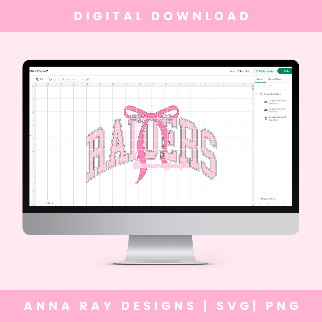 A cute, coquette‑style “Raiders” design perfect for shirts, cups, stickers, tote bags, and more. File types included in this listing are listed below. Please make sure the formats provided are compatible with your machine and software before purchasing.