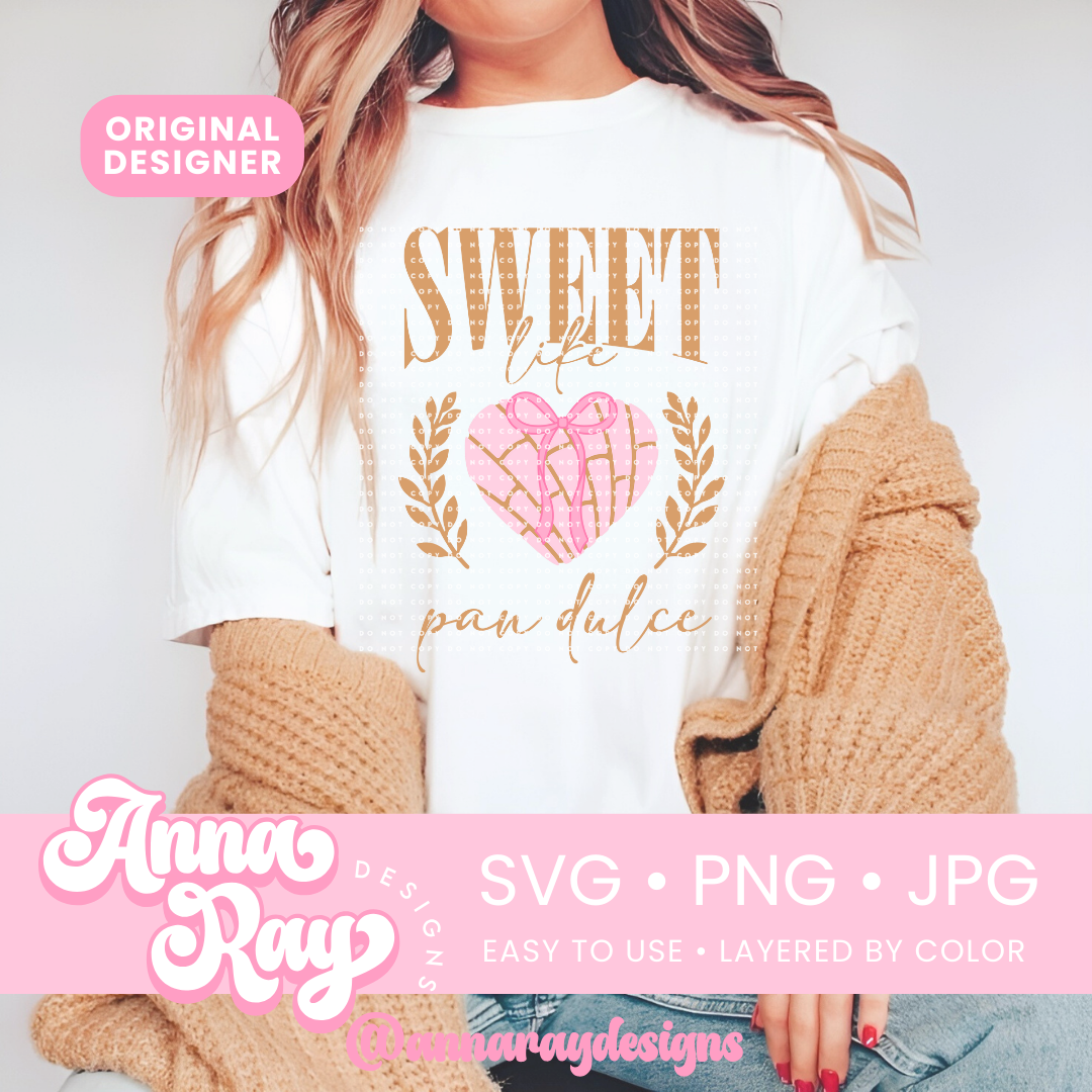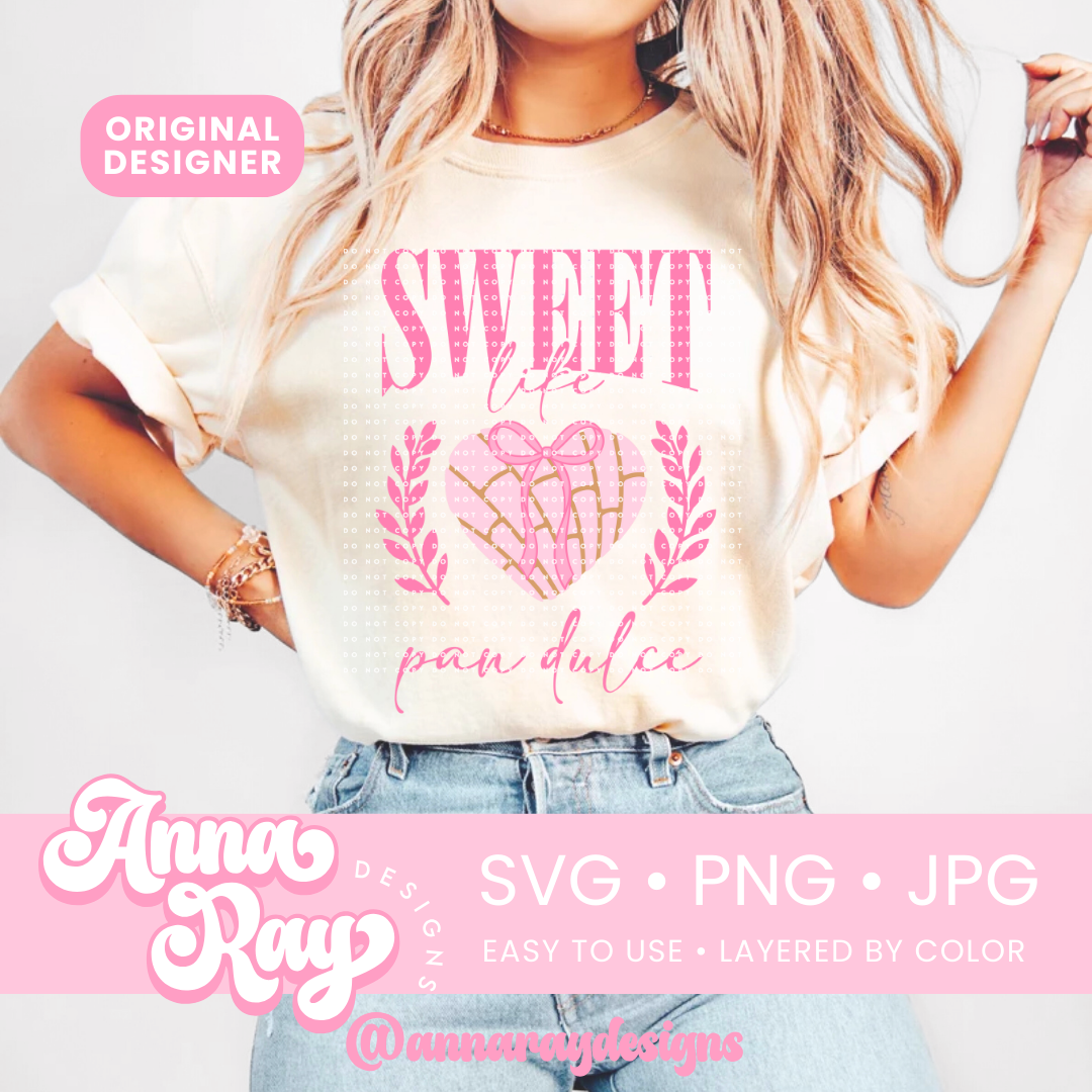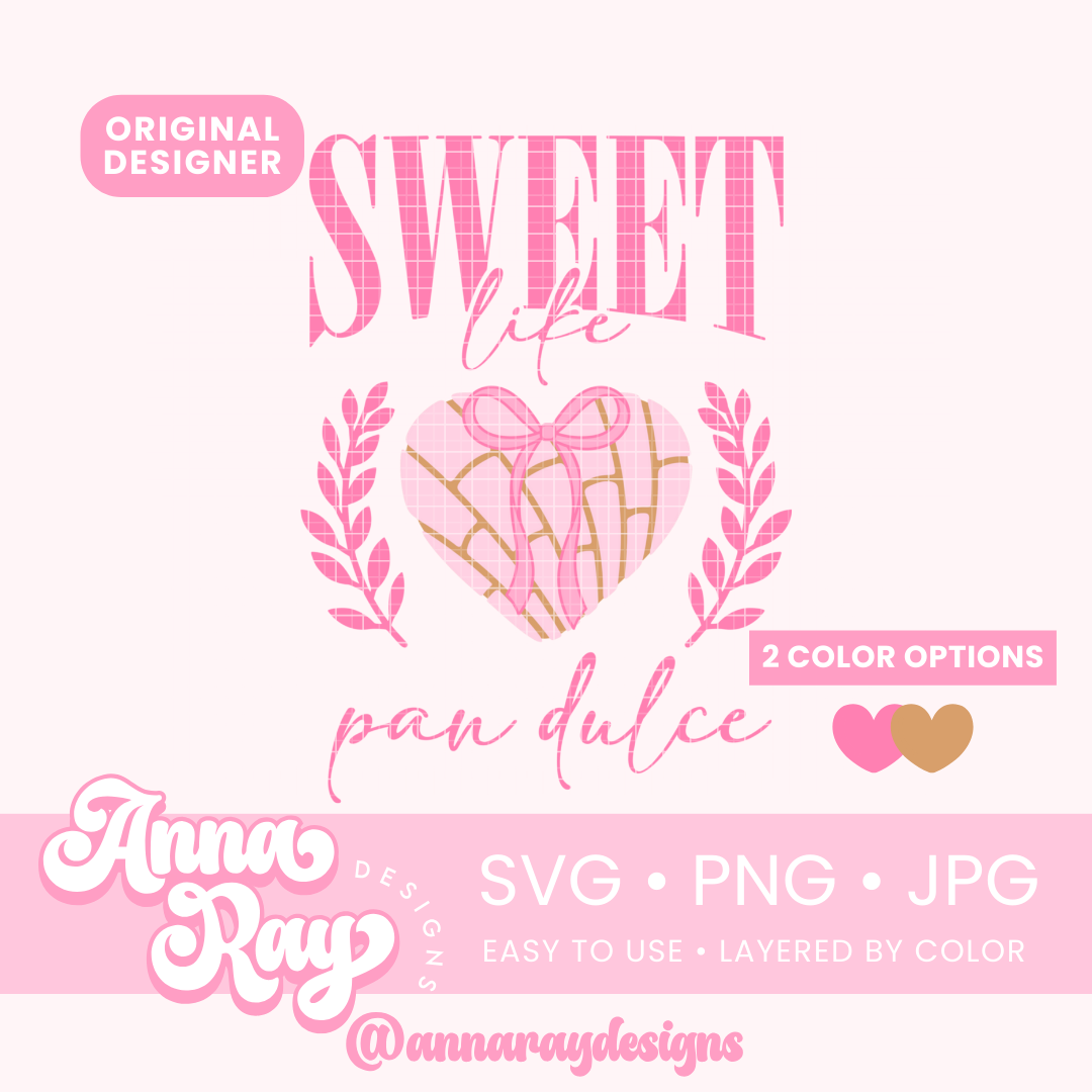 Coquette Sweet Like Pan Dulce SVG, PNG and JPG Digital Files. This Conchita design is perfect for creating items such as shirts, sweatshirts, stickers and more! All of our files are easy to use, layered by color and compatible with Cricut Design Space and Silhouette Studio.