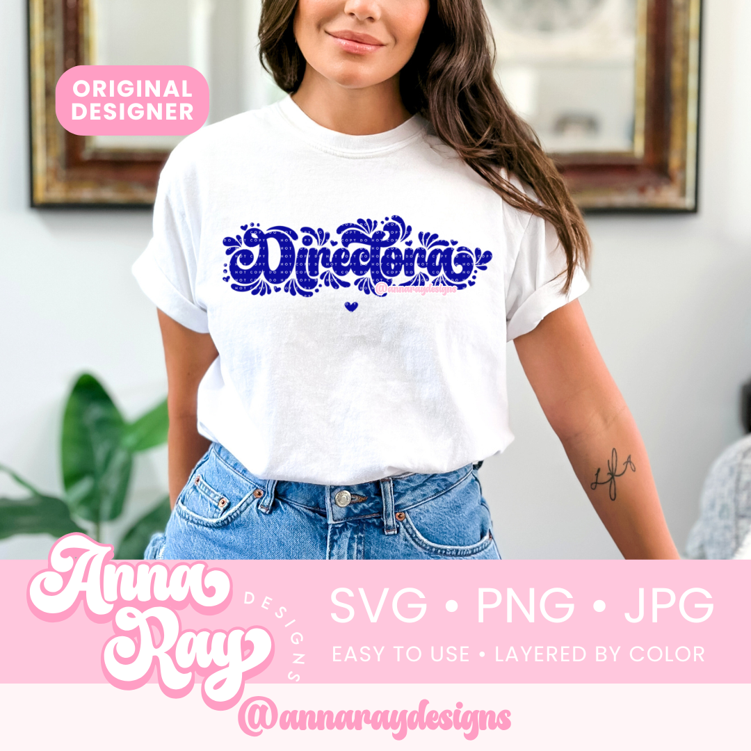 Use this trendy Directora Talavera design to create a wide variety of products, such as apparel, tote bags, drink ware, and stickers! Our files are user-friendly, color-coded, and compatible with both Cricut Design Space and Silhouette Studio.