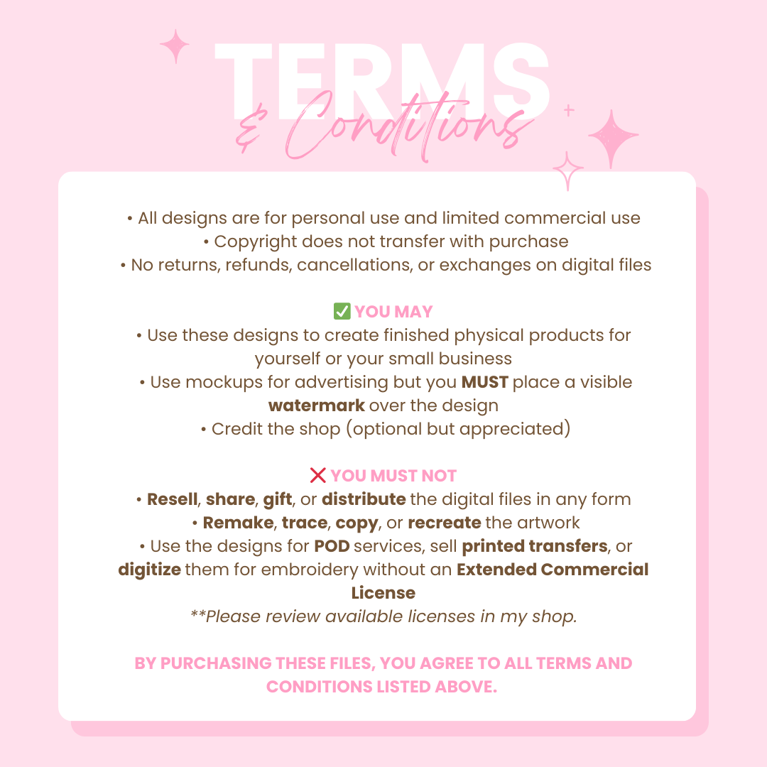 • Sell designs on POD platforms, printed transfers, decals, or digitized embroidery files without an Extended Commercial License. A separate license is required for POD use, DTF/UV transfers, sublimation transfers, embroidery digitizing, and similar production methods.