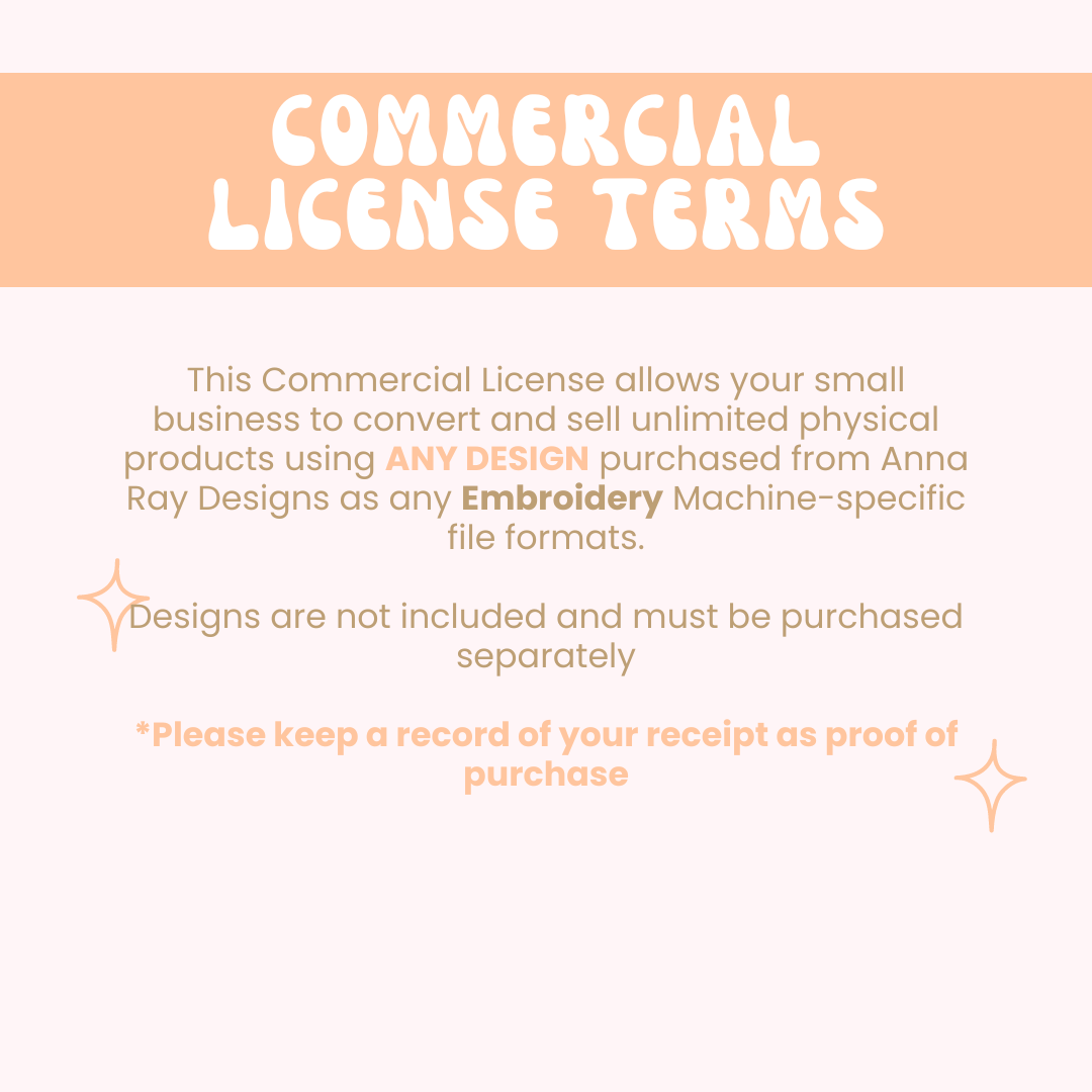 • This Extended Commercial use License allows your small business to convert and sell unlimited physical products using ANY DESIGN purchased from Anna Ray Designs as any Embroidery Machine-specific file formats.
