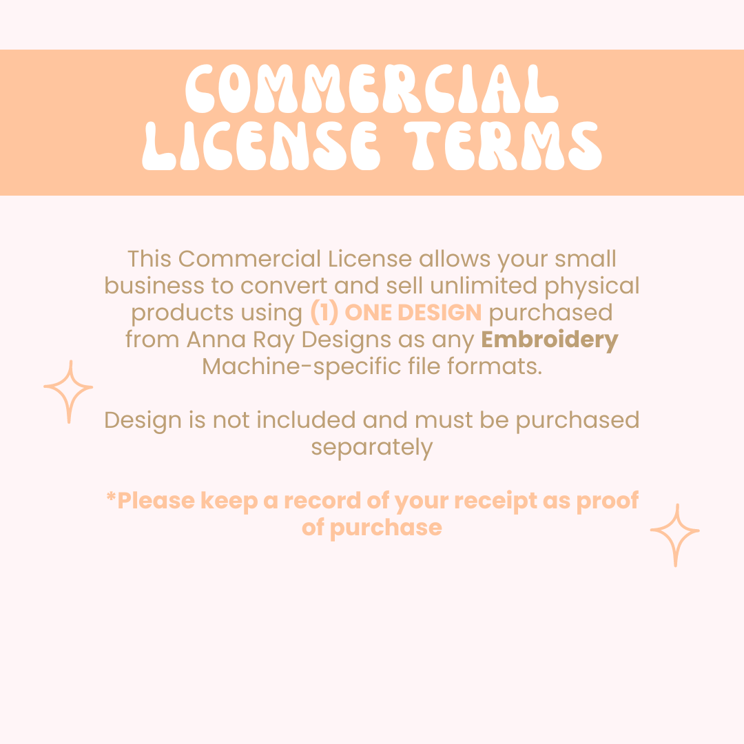 • This Extended Commercial use License allows your small business to convert and sell unlimited physical products using (1) ONE DESIGN purchased from Anna Ray Designs as any Embroidery Machine-specific file formats.