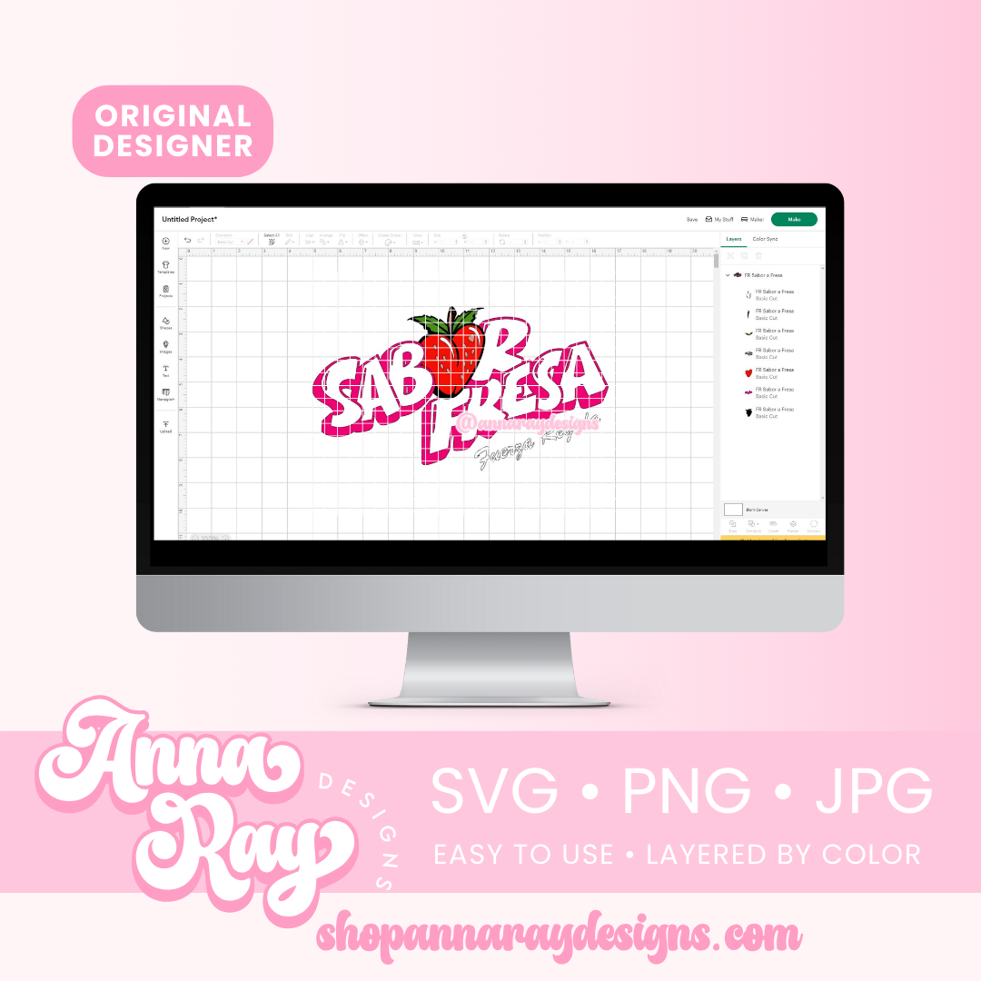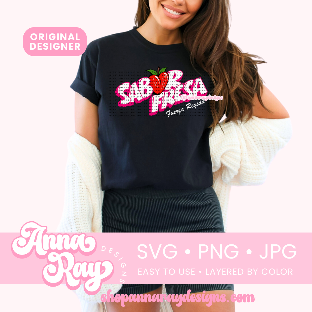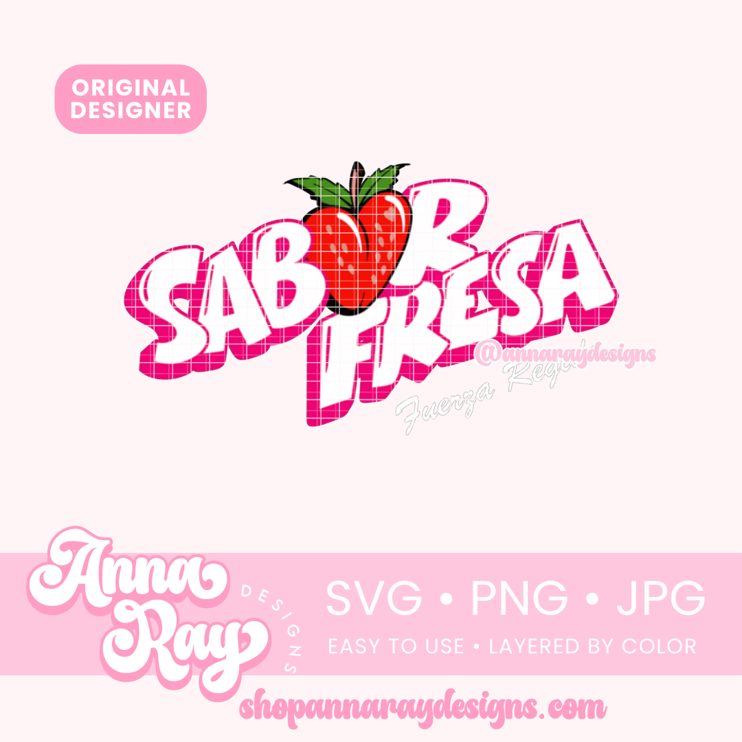 FR Sabor Fresa SVG, PNG and JPG Digital Files. This fresa design is perfect for creating items such as shirts, drink ware, stickers, tote bags and more! All of our files are easy to use, layered by color and compatible with Cricut Design Space and Silhouette Studio.