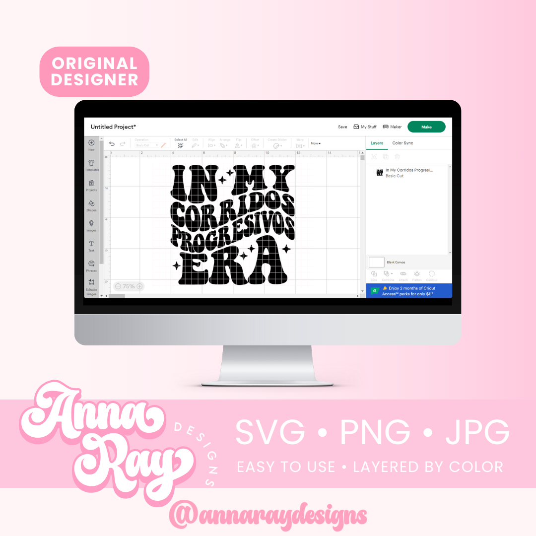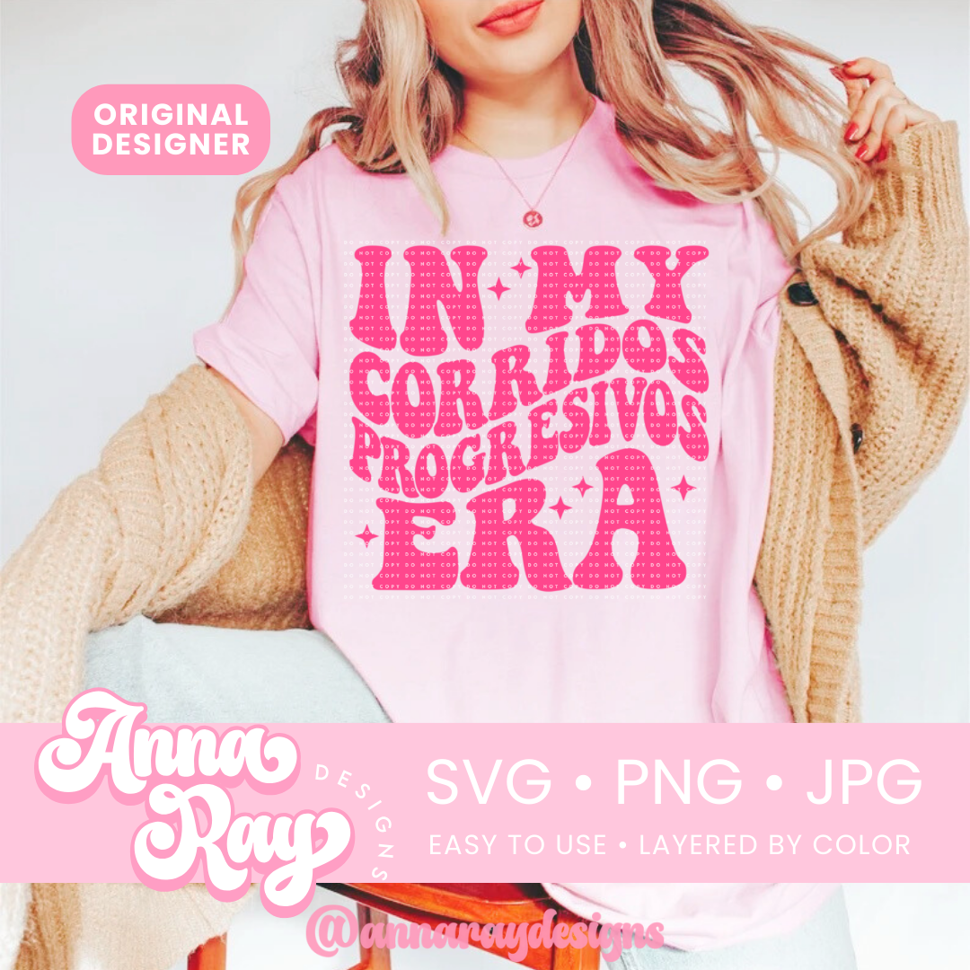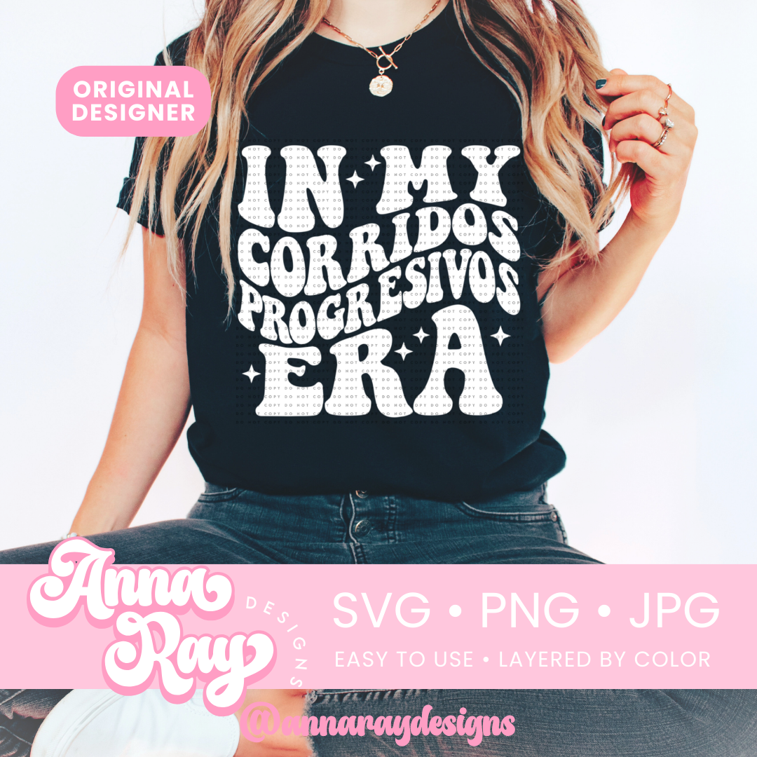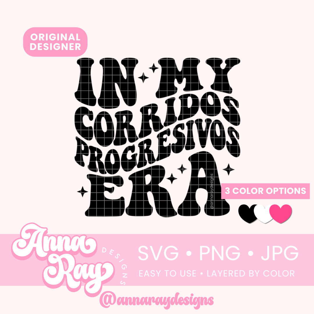 In My Corridos Progresivos Era SVG, PNG and JPG Digital Files. This design is perfect for creating items such as shirts, drink ware, stickers, tote bags and more! All of our files are easy to use, layered by color and compatible with Cricut Design Space and Silhouette Studio.