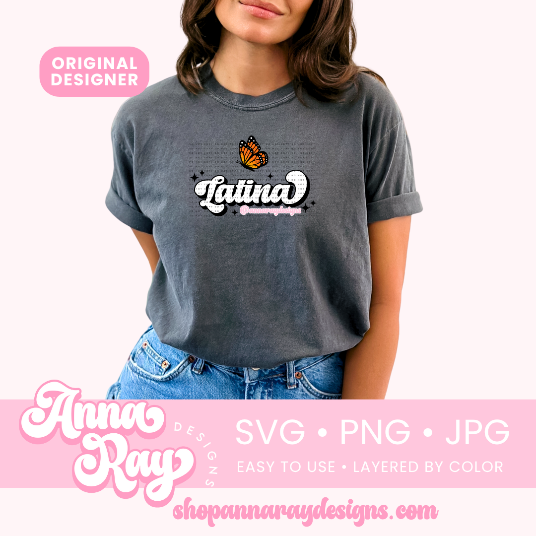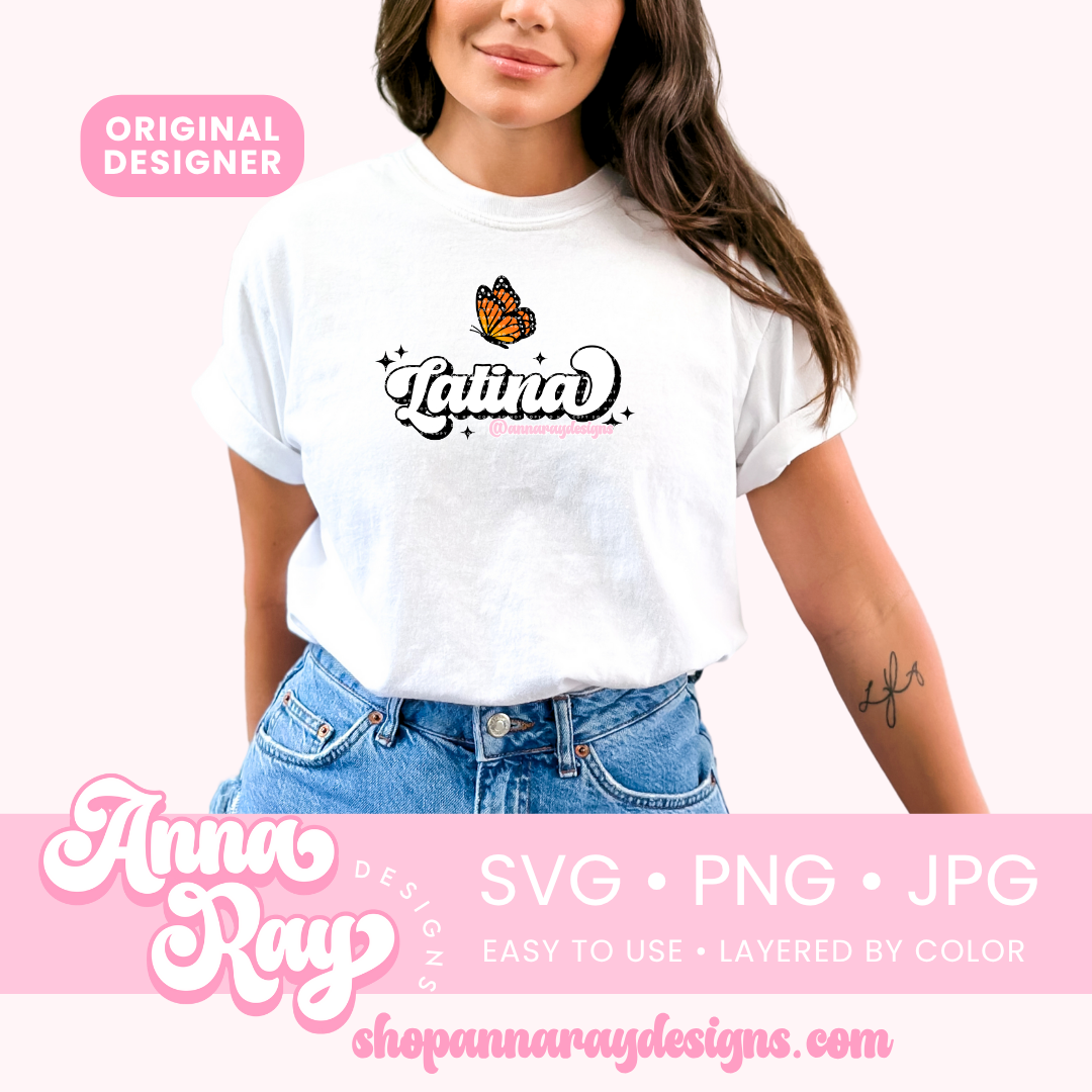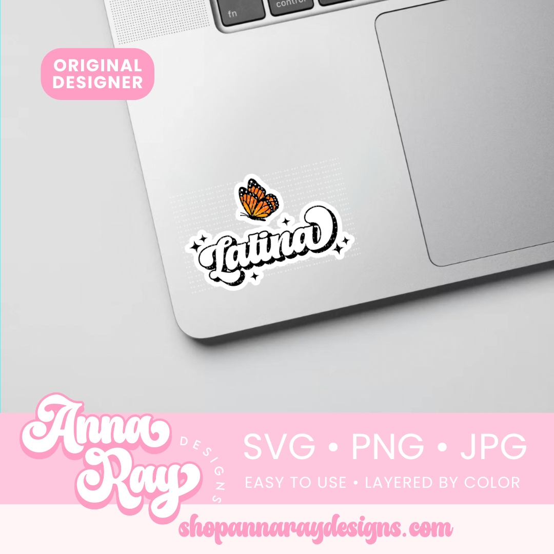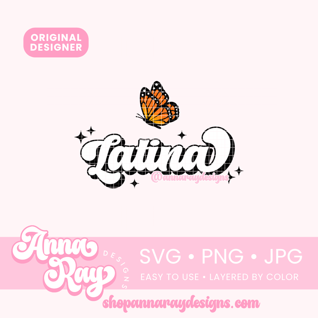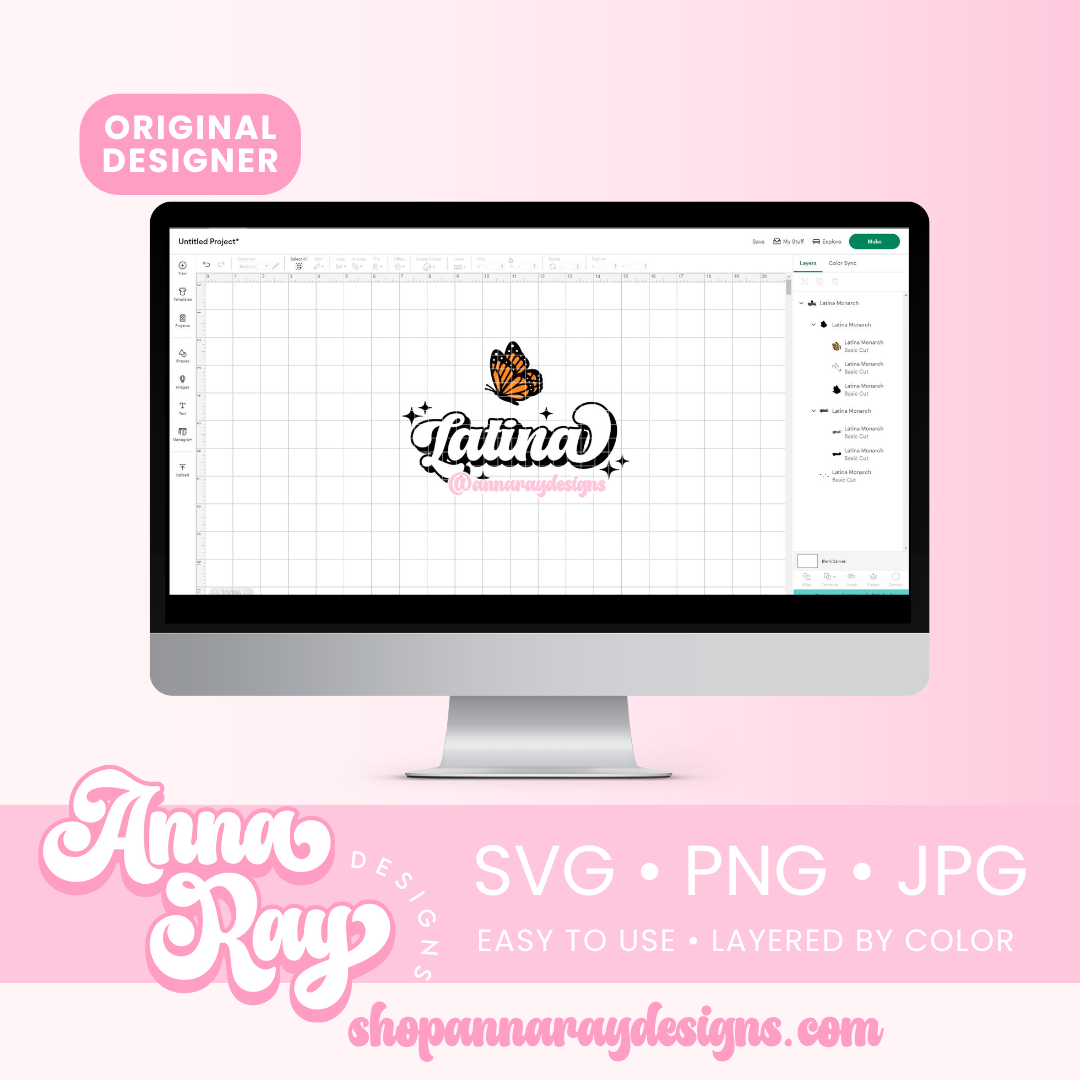 Use this stylish Latina Monarch design to create a wide variety of products, such as apparel, tote bags, drink ware, and stickers! Our files are user-friendly, color-coded, and compatible with both Cricut Design Space and Silhouette Studio.