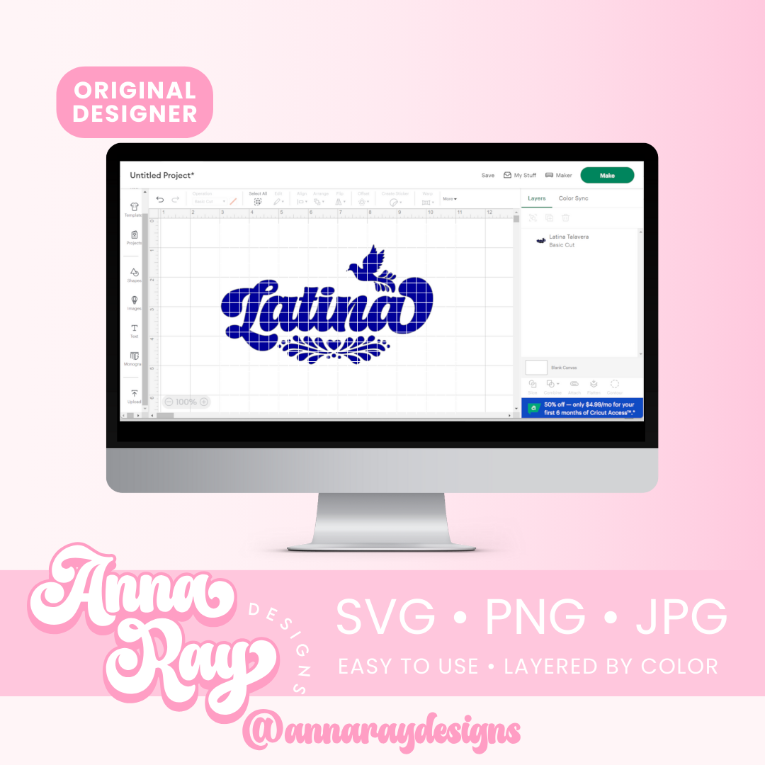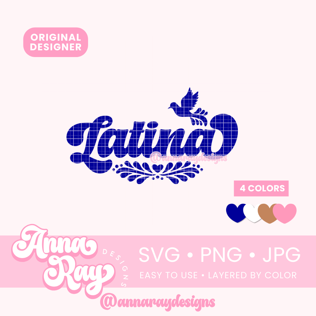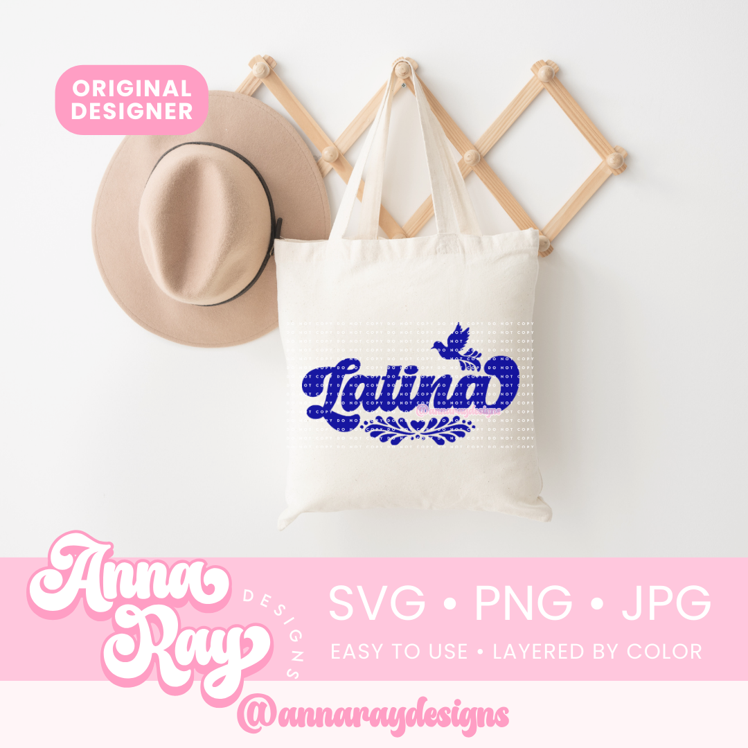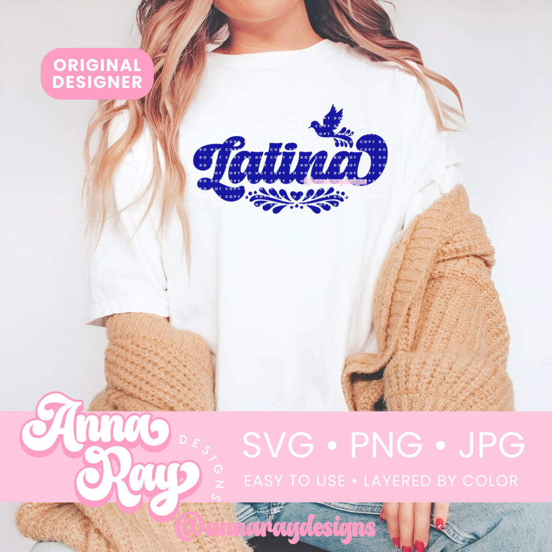 Latina Talavera SVG, PNG and JPG Digital Files. This Talavera design is perfect for creating items such as shirts, drink ware, stickers, tote bags and more! All of our files are easy to use, layered by color and compatible with Cricut Design Space and Silhouette Studio.