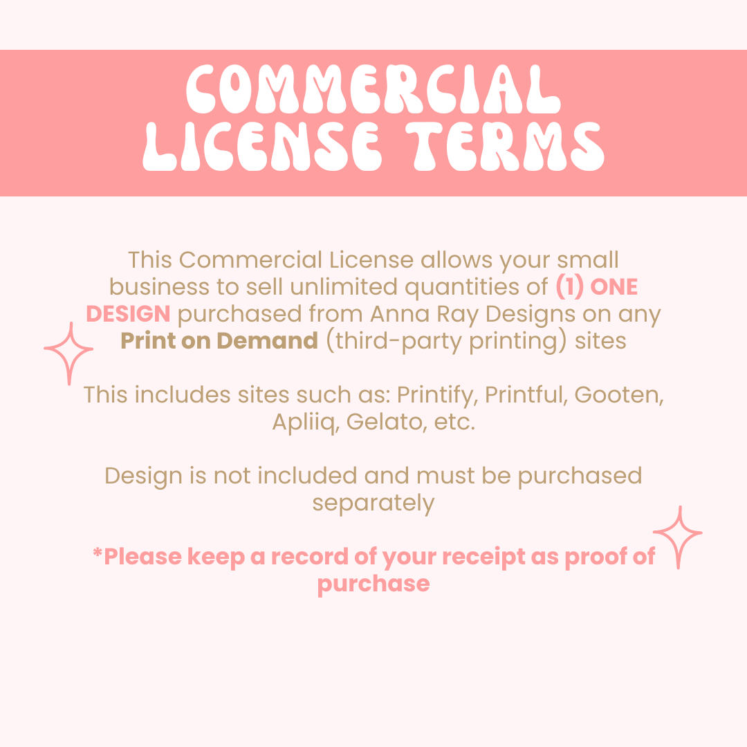 • This Extended Commercial use License allows your small business to sell unlimited quantities of (1) ONE DESIGN purchased from Anna Ray Designs on any Print on Demand (third-party printing) sites.