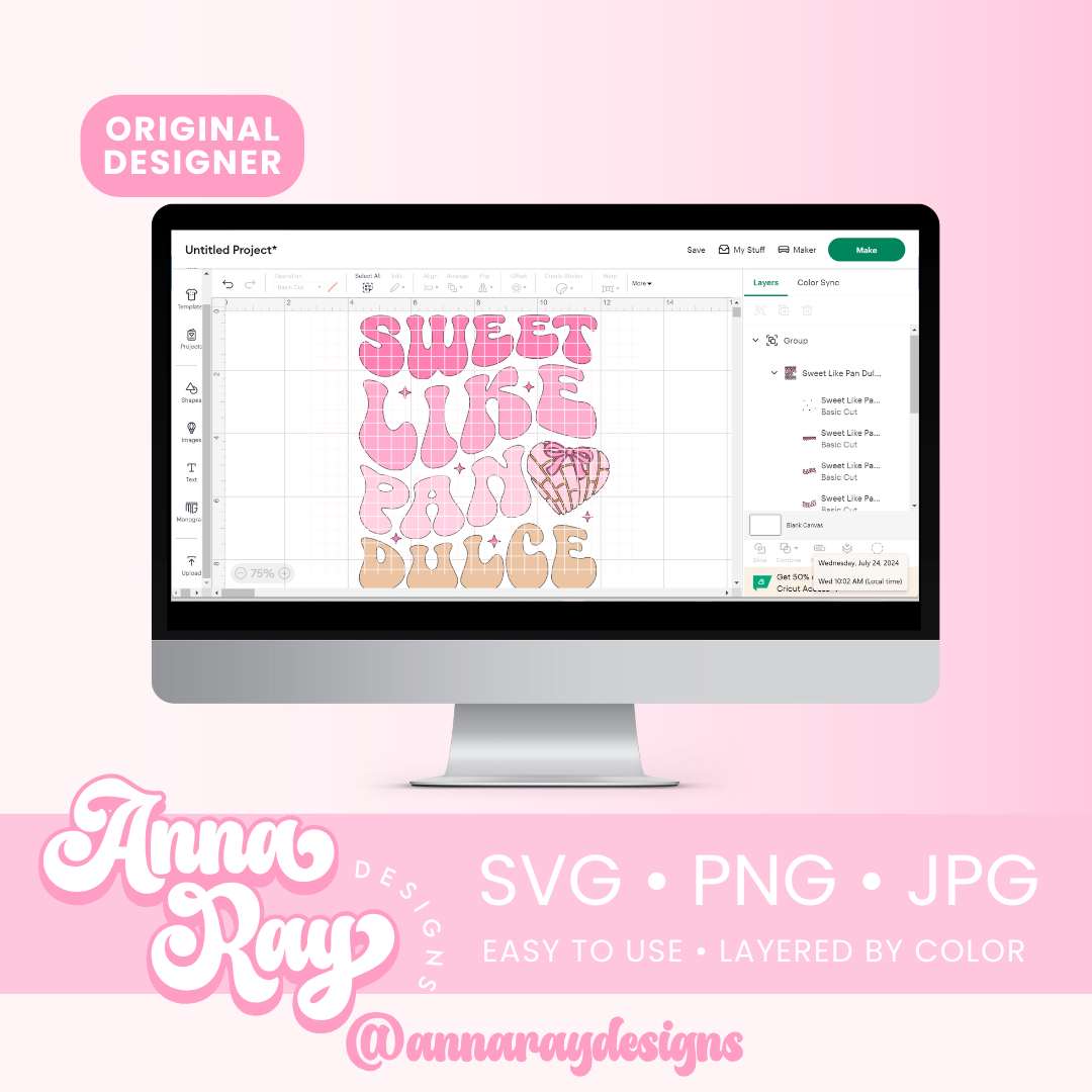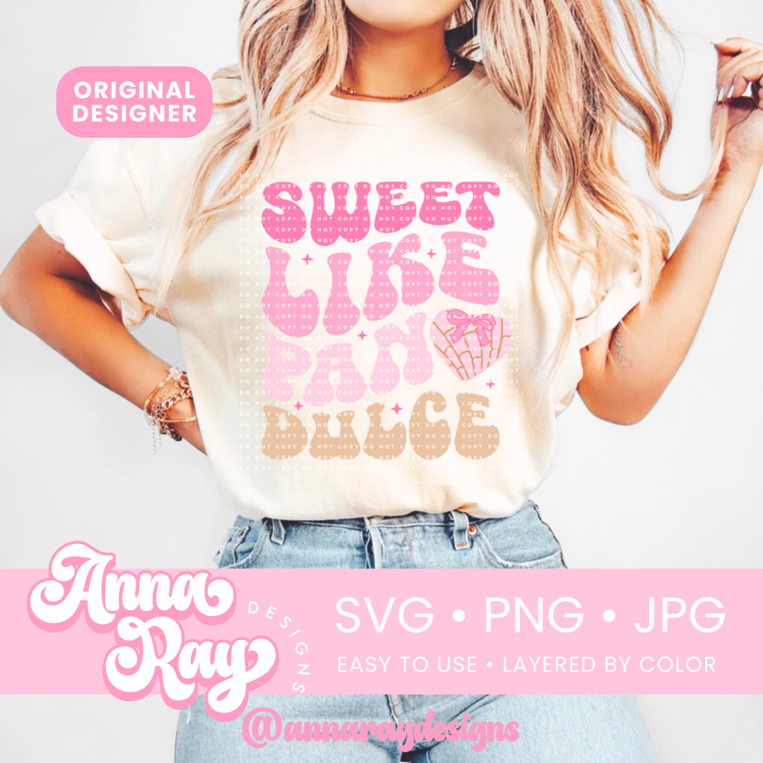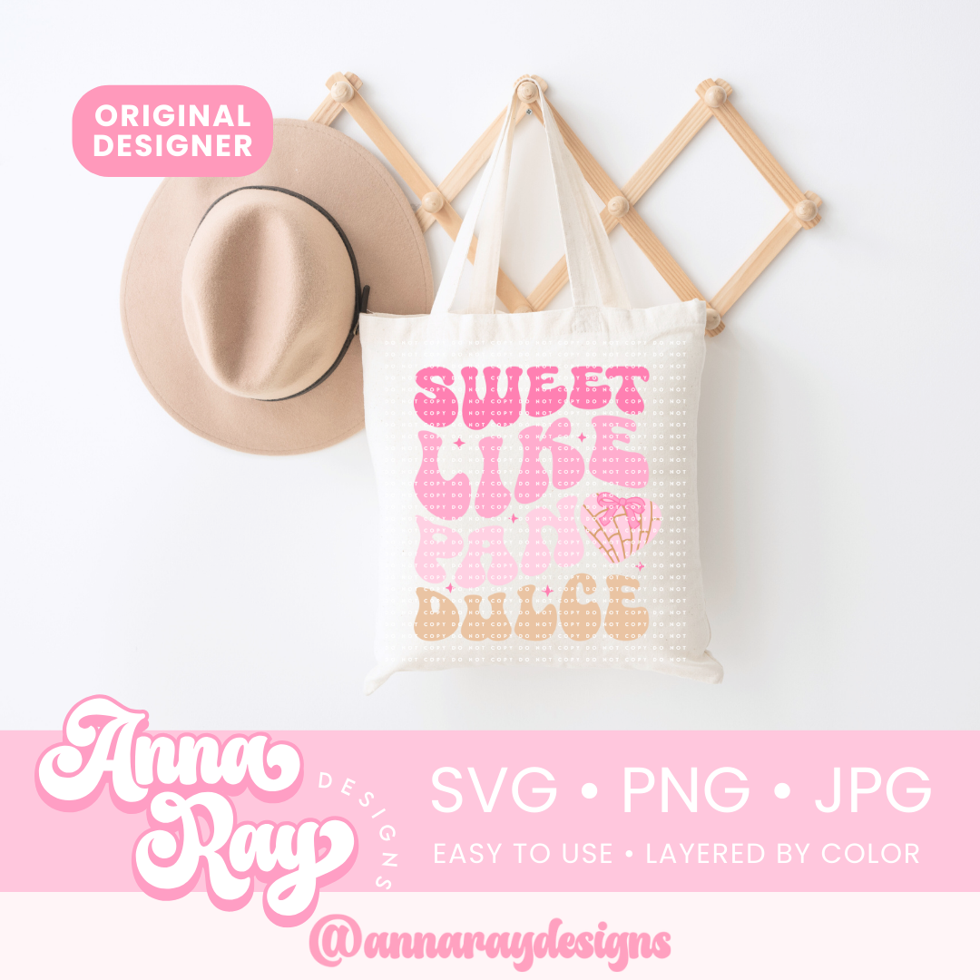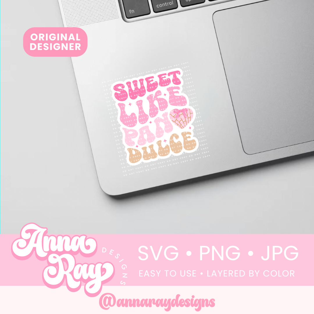 Sweet Like Pan Dulce SVG, PNG and JPG Digital Files. This Concha design is perfect for creating items such as shirts, cups, stickers, tote bags and more! All of our files are easy to use, layered by color and compatible with Cricut Design Space and Silhouette Studio.