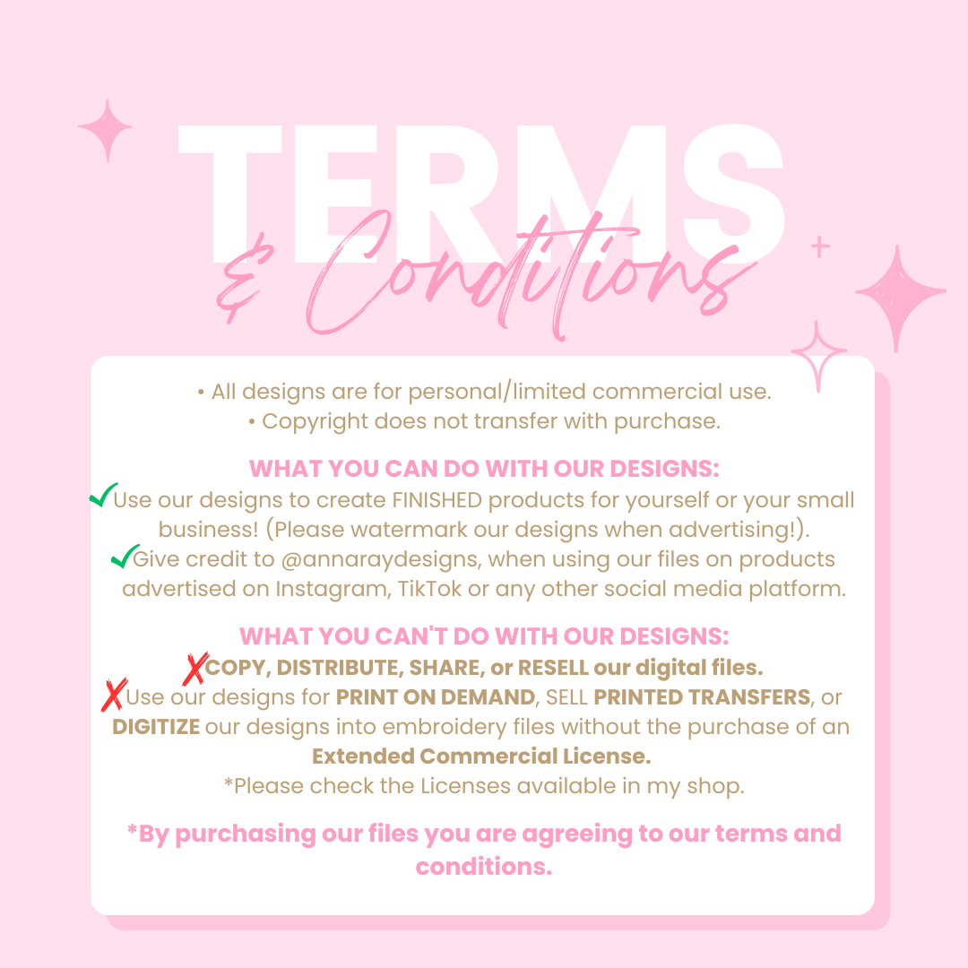 • You MUST give credit to @annaraydesigns, when using our files on products advertised on Etsy, Instagram, TikTok or any other social media platform.