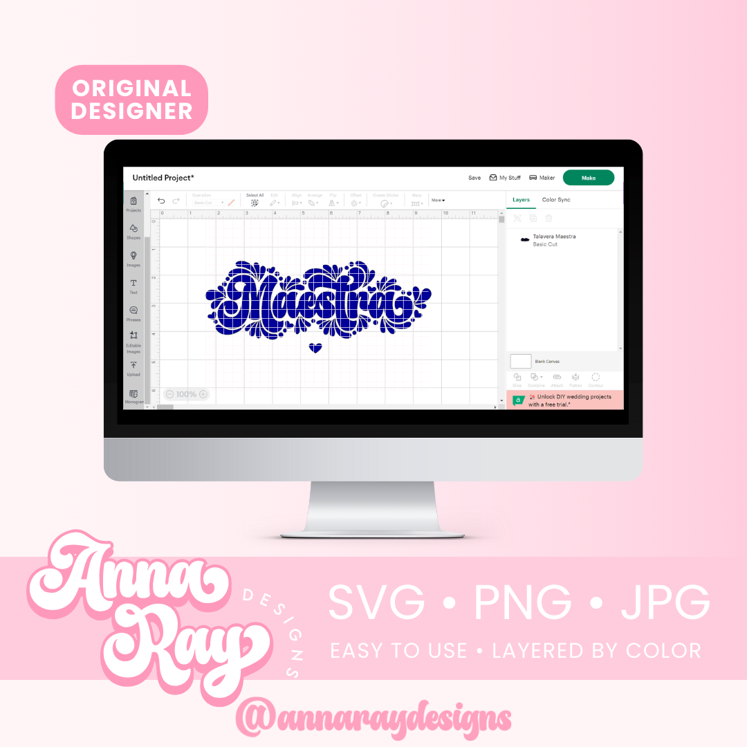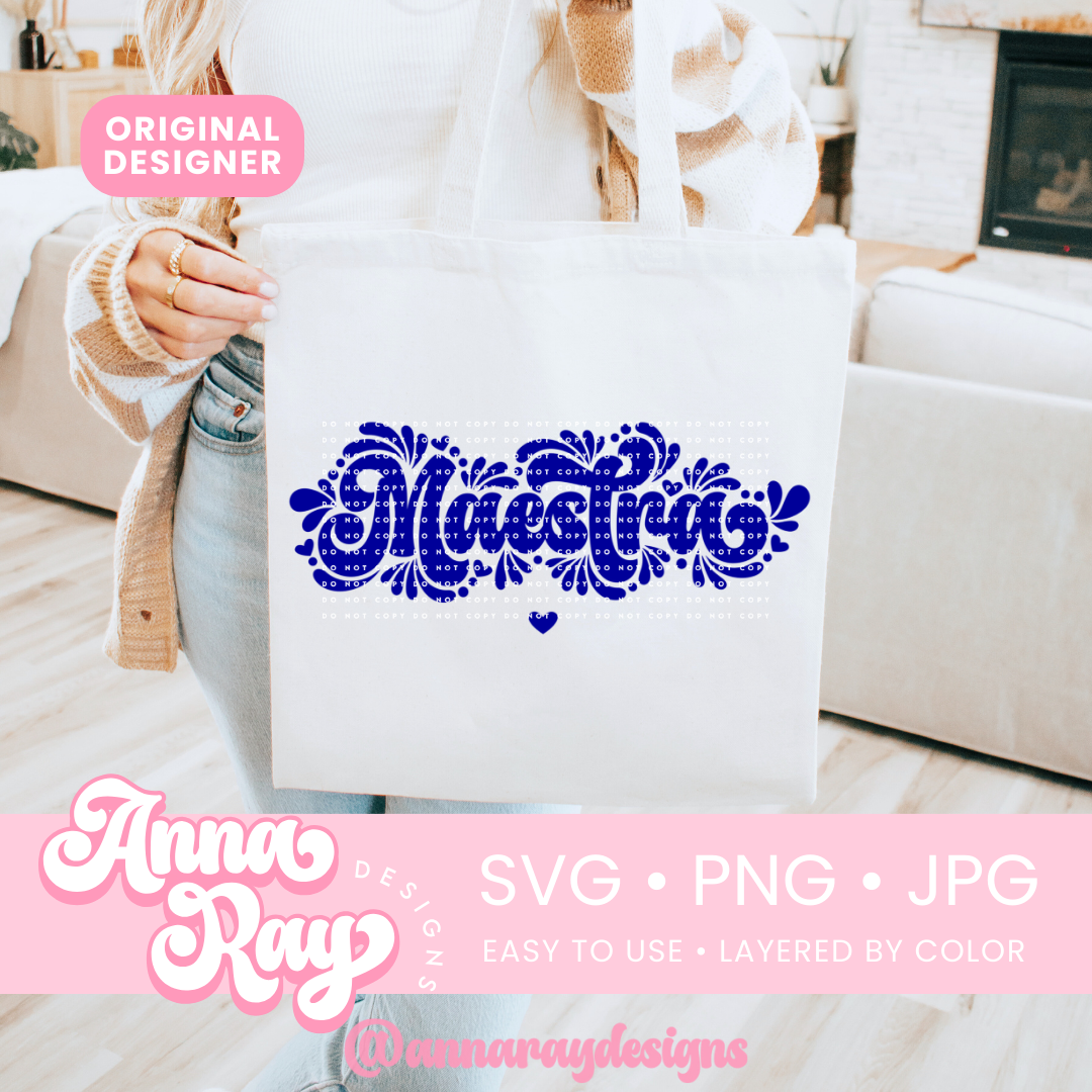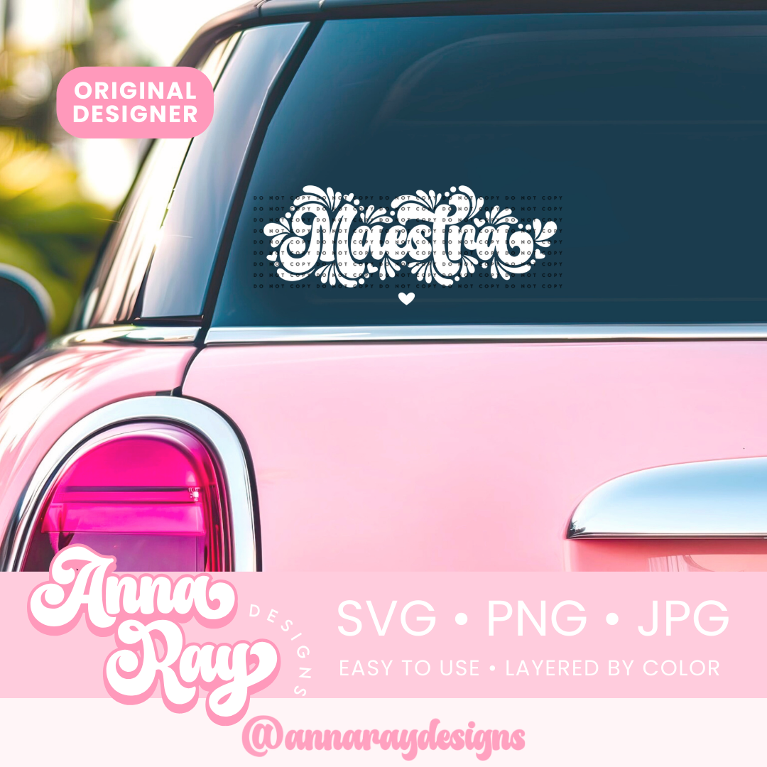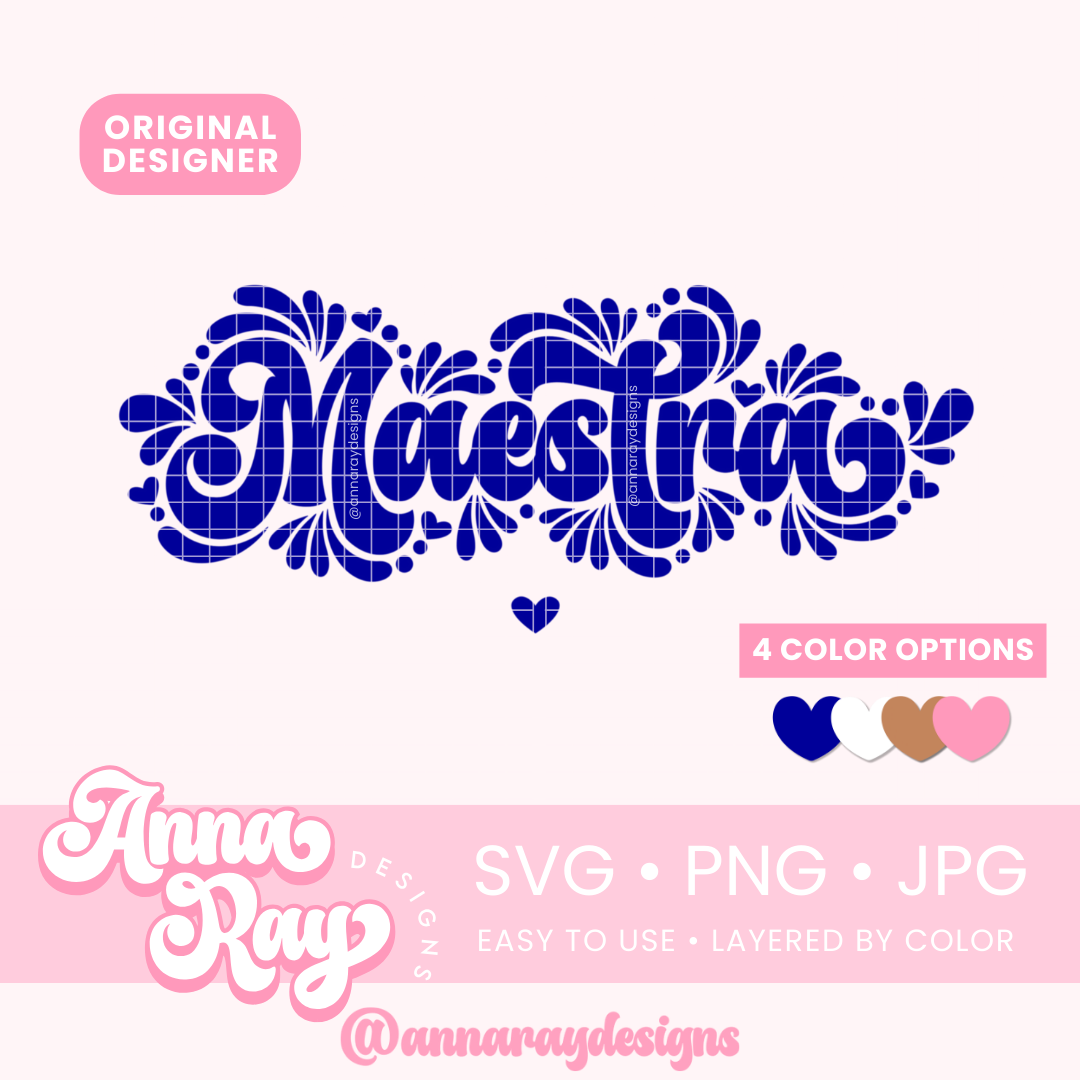 Mexican Talavera Maestra SVG, PNG and JPG Digital Files. This Teacher design is perfect for creating items such as shirts, drink ware, stickers, tote bags and more! All of our files are easy to use, layered by color and compatible with Cricut Design Space and Silhouette Studio.